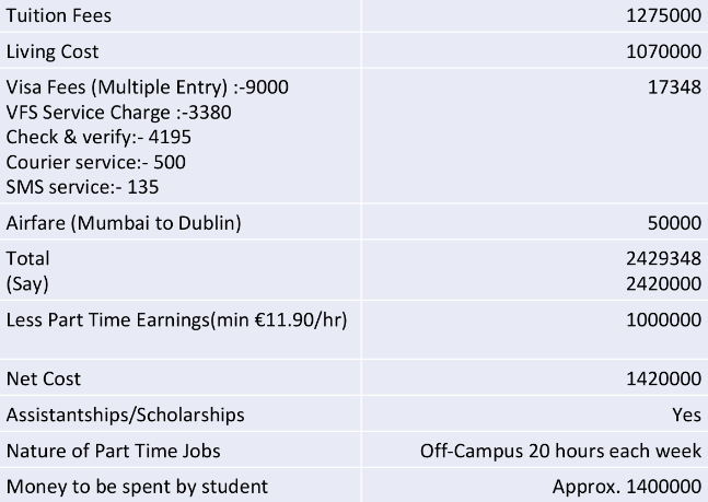 • Evidence that the student has immediate access to Tuition Fees + Living expenses for all the years. €12,000 is the estimated cost of living in Ireland as per Irish Embassy for a student for one academic year. The cost of total duration of study and stay needs to be shown in liquid funds such as Education Loan, Bank Balances and Fixed Deposits.• It is highly recommended that the tuition fee should not be sponsored only through the education loan, which means the sponsor should have 6 months old liquid funds in their account apart from education loan.